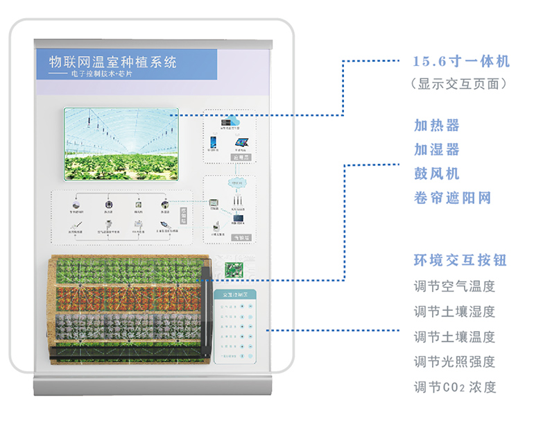 用智能一體機(jī)和環(huán)境交互按鈕結(jié)合三維模型展示智慧農(nóng)業(yè)大棚的原理及運(yùn)行方式。 |
